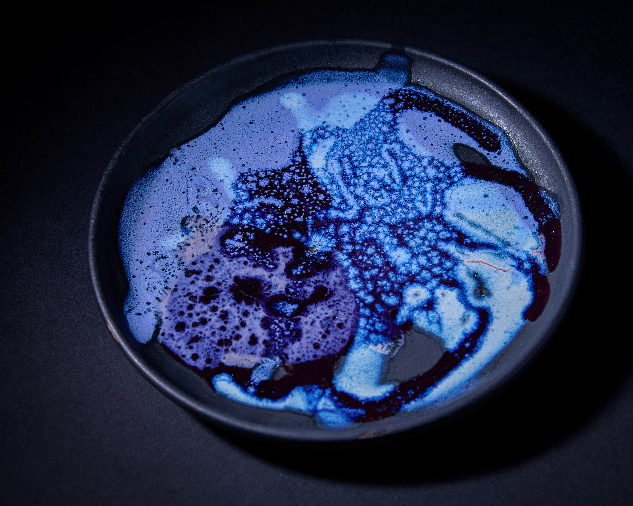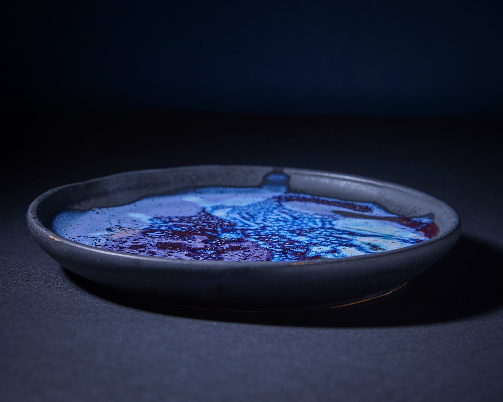 This one of a kind plate features black and a range of blue glazes. This will be a truly stunning piece for your dinner table. It is food, dishwasher and microwave safe.