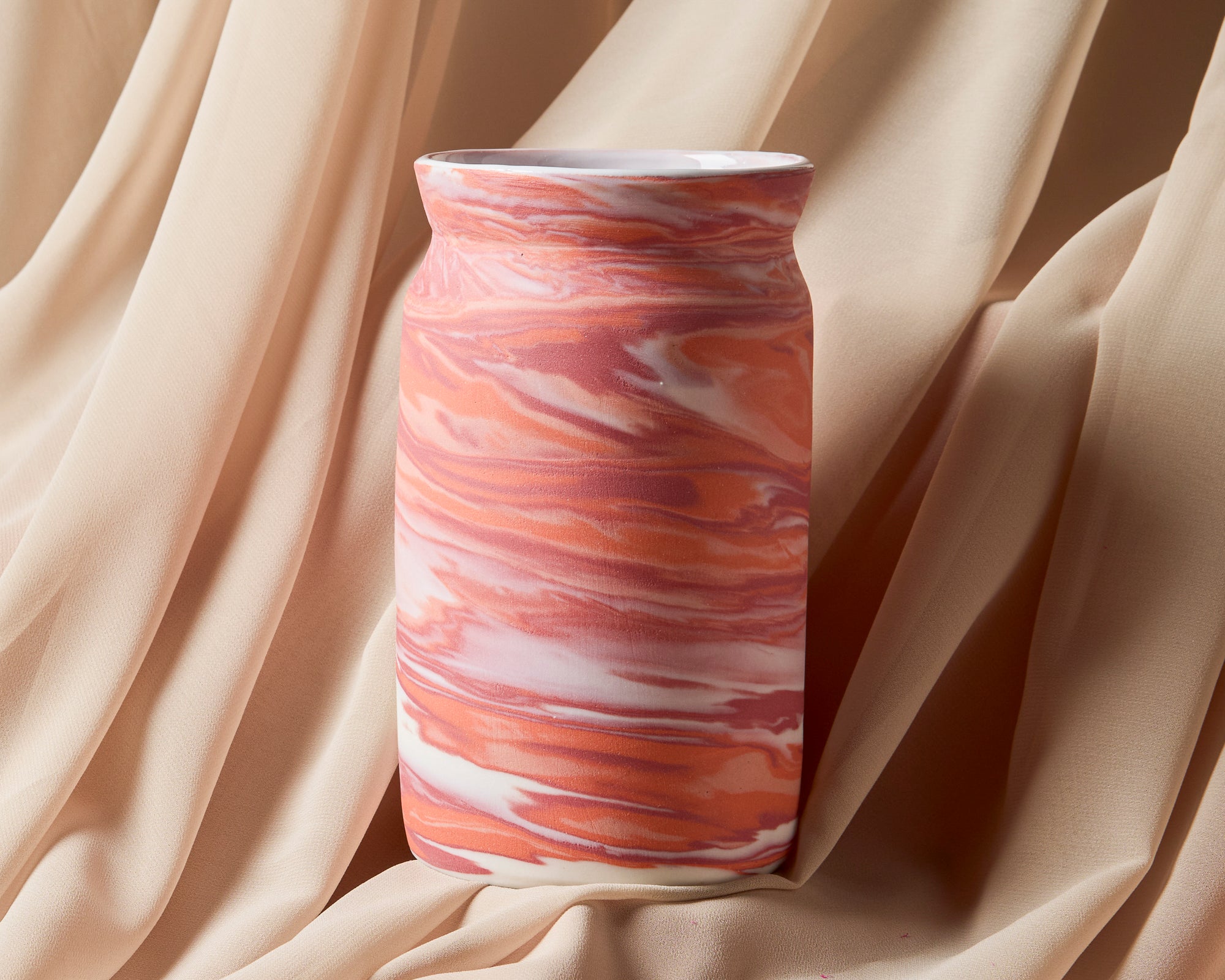 This uniquely marbled vase features pink, orange & white marbled clay. It will make an excellent gift for yourself or someone special. The exterior has been left unglazed to feature the one of a kind details. The inside has a white glaze, allowing it to hold water.